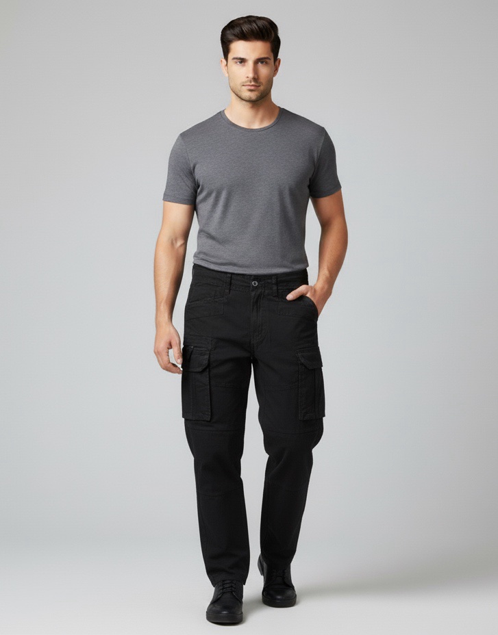 These are classic black cargo trousers designed with a versatile straight-leg fit. Crafted from a durable, high-quality fabric, these pants offer both resilience and comfort for everyday wear.