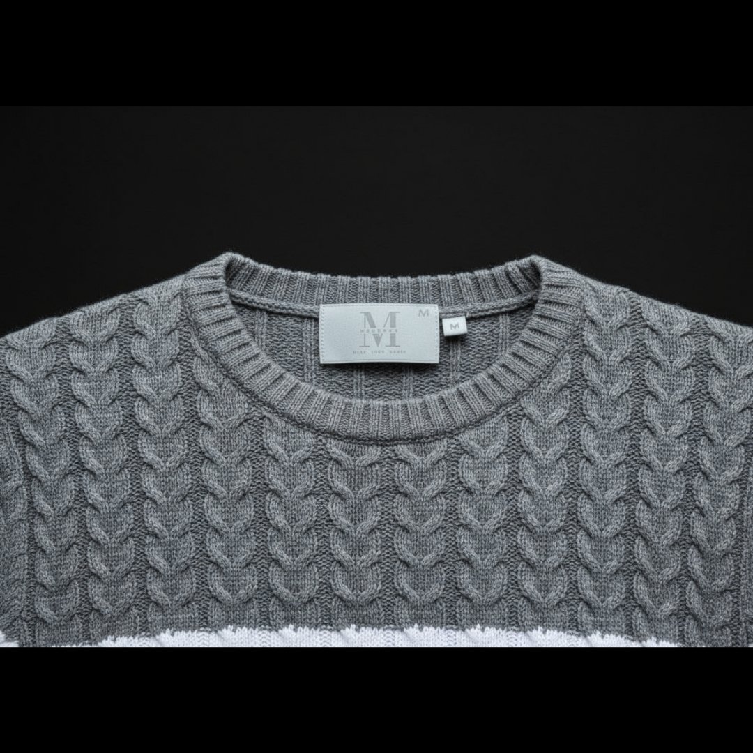 Elevate your knitwear collection with this unique, textured crewneck. It blends a cozy, all-over cable knit with a sophisticated color-block design. The main body features a neutral tan/grey hue, contrasted by strong horizontal bands of white, black, and darker grey. This modern take on a classic knit offers substantial warmth and depth, providing a standout piece that works well with dark denim or tailored casual trousers.