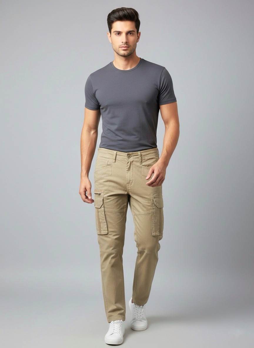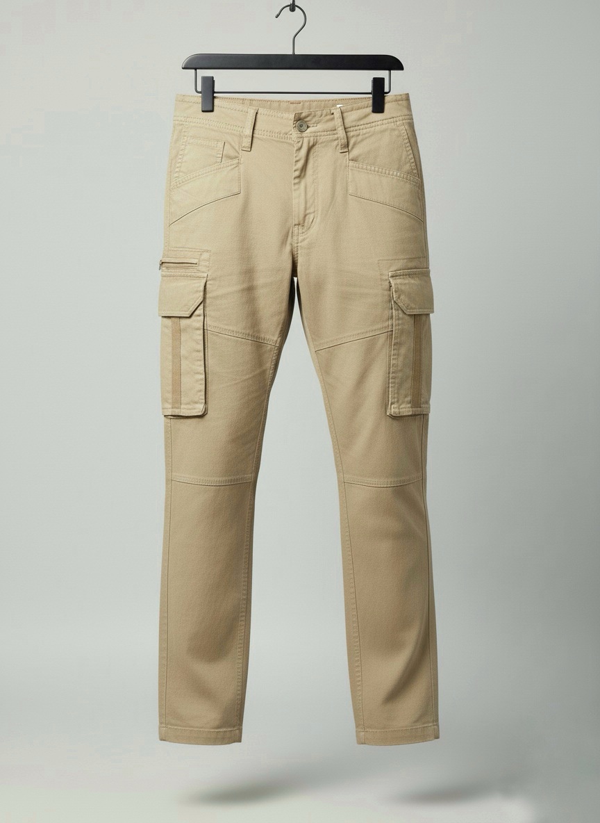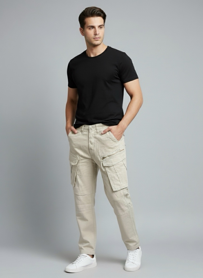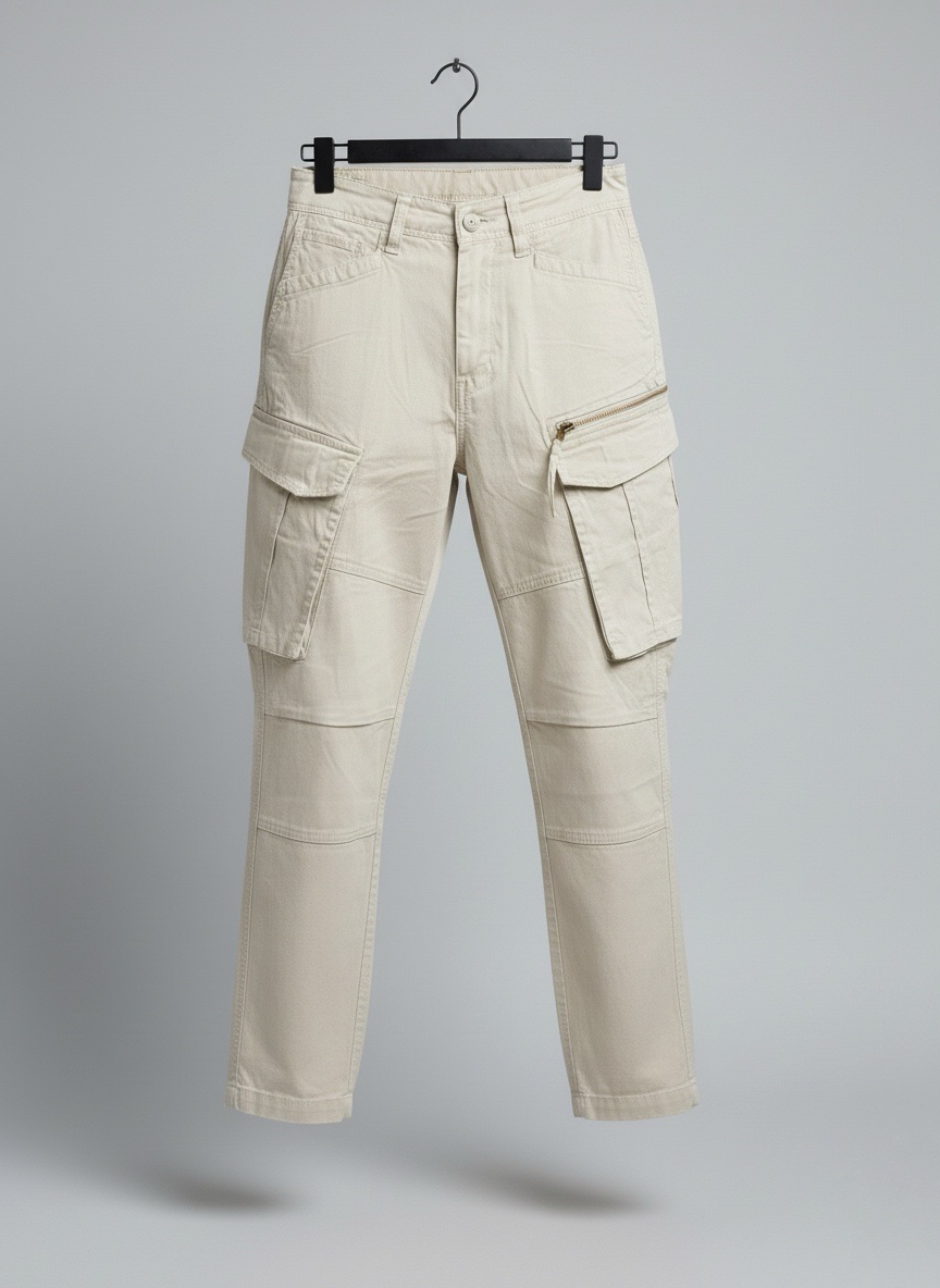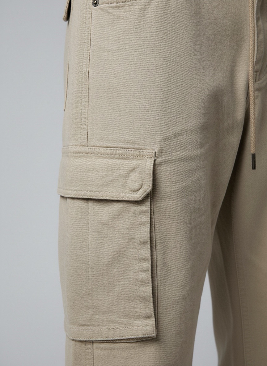 Experience the perfect blend of comfort and street style with these cream cargo pants. Featuring an adjustable drawstring waistband for an ideal, relaxed fit, these trousers are designed for all-day wear. The neutral khaki/sand tone makes them incredibly versatile, easily pairing with bright colors or classic neutrals. The deep, functional flap pockets provide the signature utility look and practical storage. A must-have for a relaxed yet stylish wardrobe.