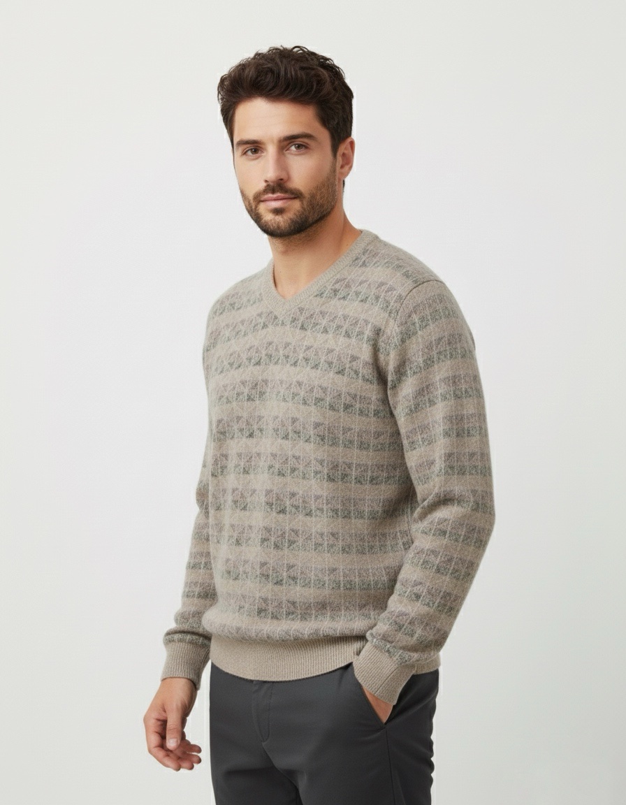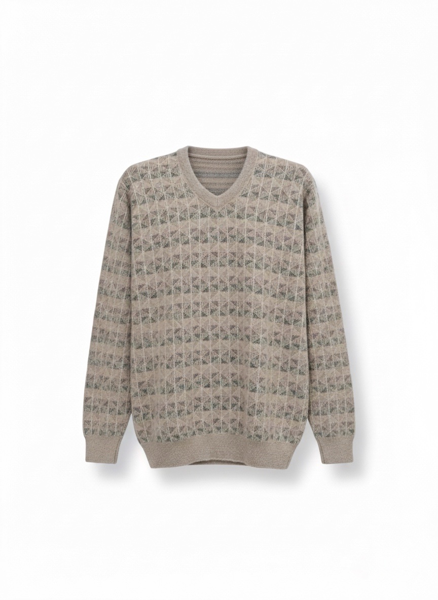 Earth Tone V-Neck Sweater with Checkered Pattern Copy Copy