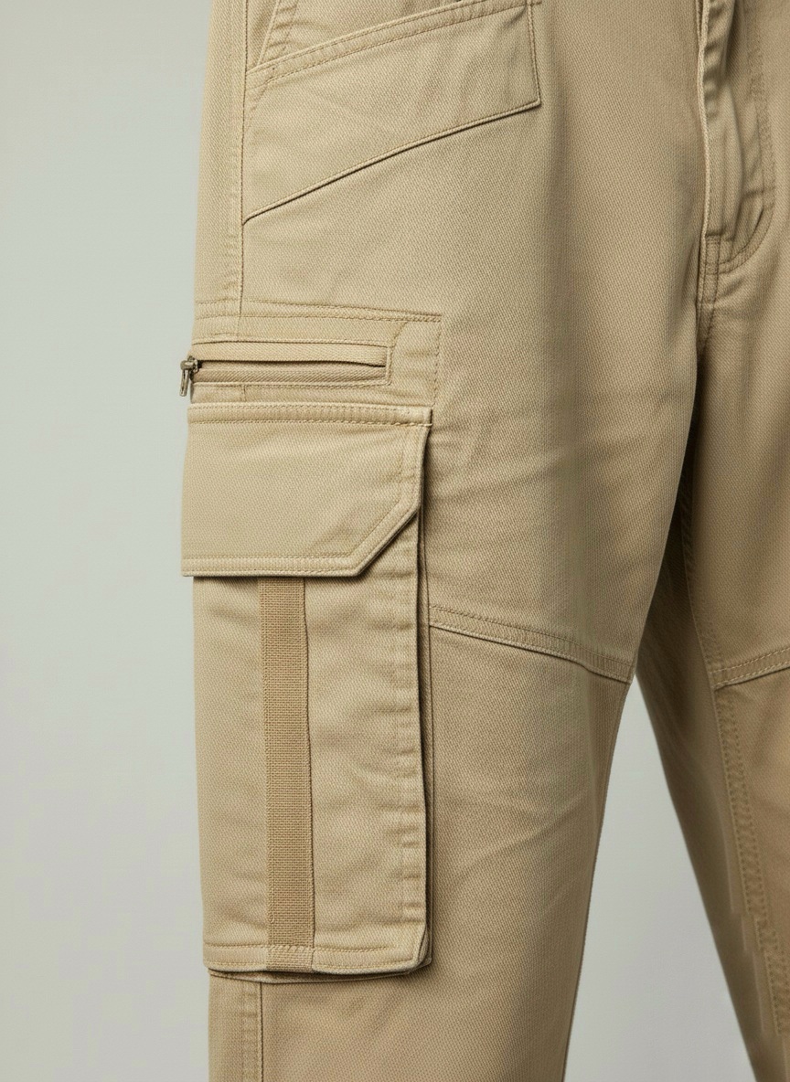 The key feature is the twin side cargo pockets, each secured with a flap. These pockets are accented with a subtle contrast webbing stripe running vertically down the center of the pocket flap, adding a touch of functional, military-inspired detail. The trousers are finished with classic front slash pockets and a standard zip-fly and button closure.