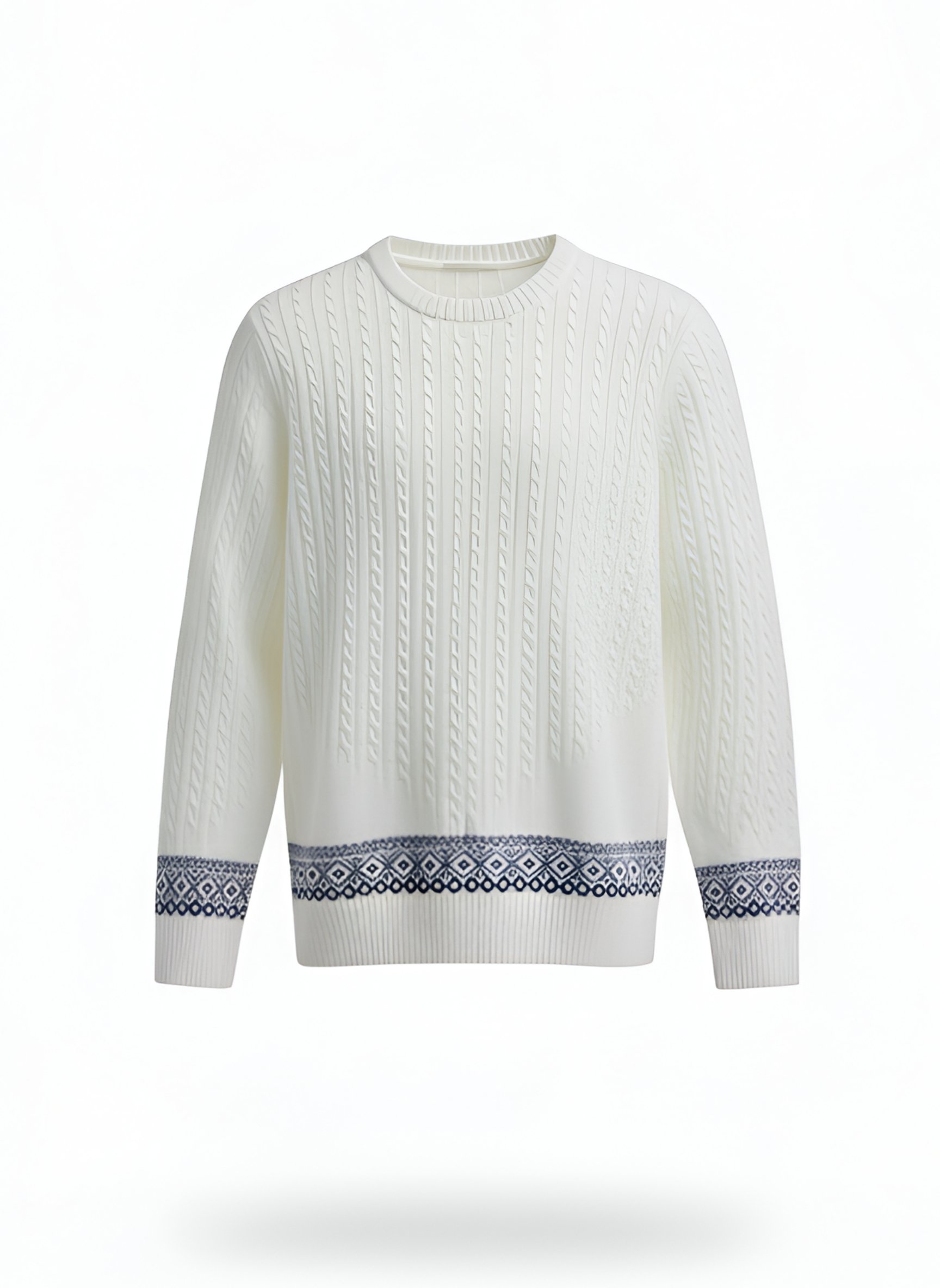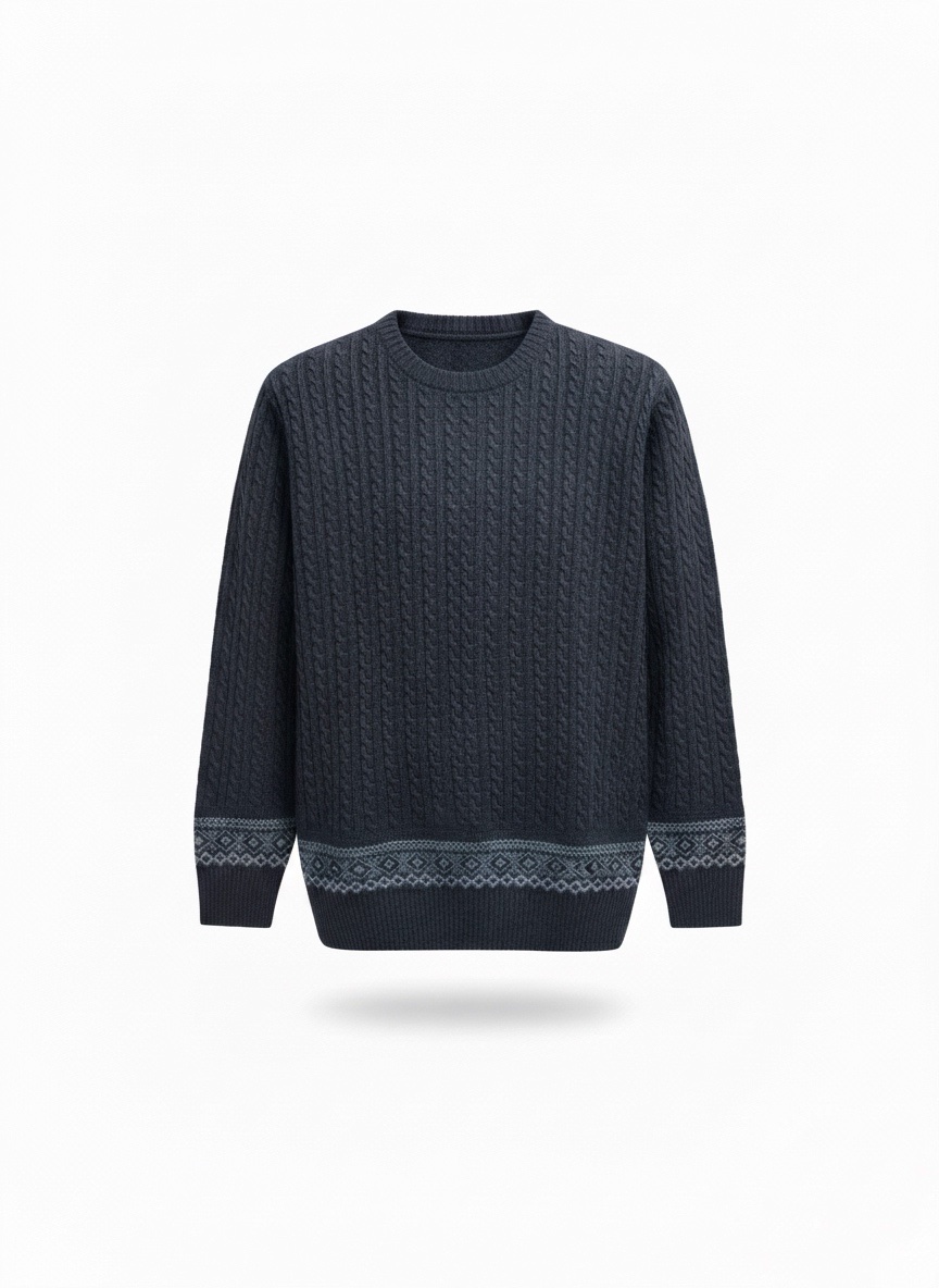 Stylish Navy Cable Sweater with Patterned Cuff & Hem