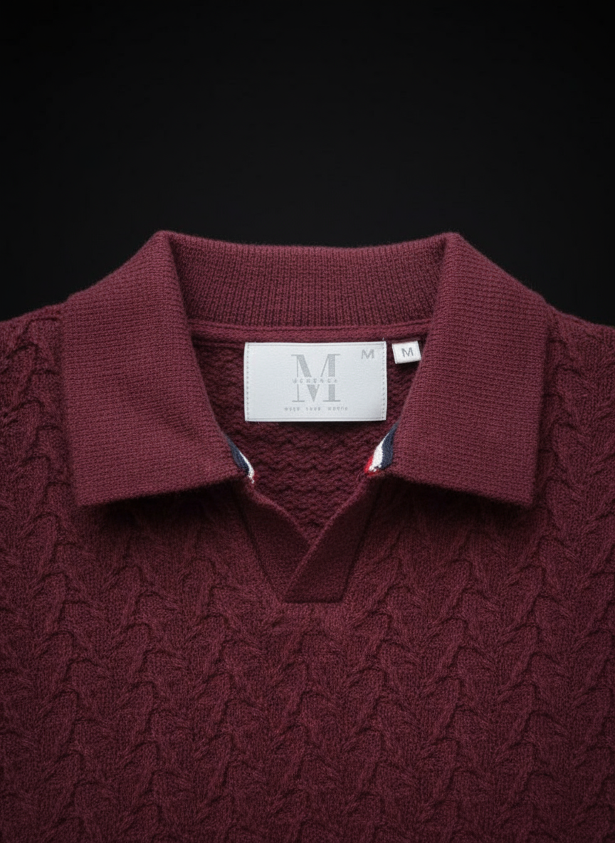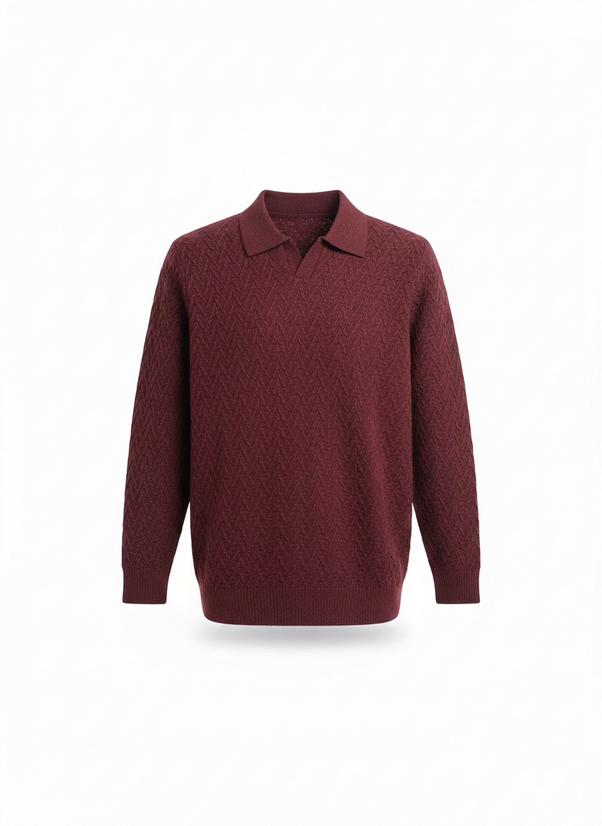 Embrace classic sophistication and warmth with this distinguished maroon polo sweater. This piece beautifully blends the casual comfort of a polo shirt with the cozy texture of a traditional knit.