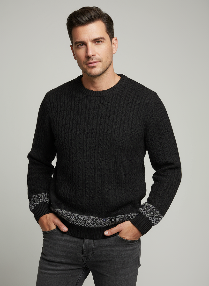 Black Crewneck Sweater with Fair Isle Accent