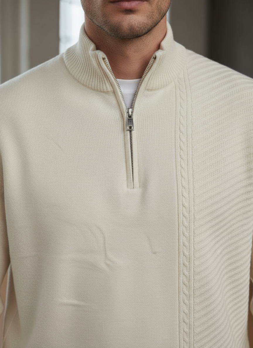 The sweater features a cozy mock neck and a smooth half-zip closure, making it effortless to layer and adjust for warmth. The design is subtly elevated by an asymmetrical texture panel running vertically down the chest. This detail beautifully contrasts a smooth knit with precise diagonal ribbing and a delicate vertical cable-knit accent, adding depth and bespoke style to the garment.