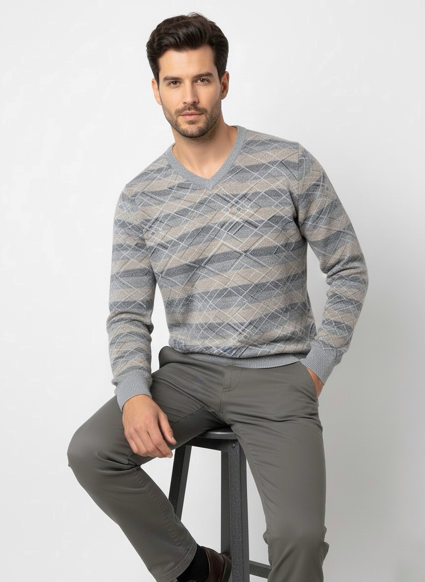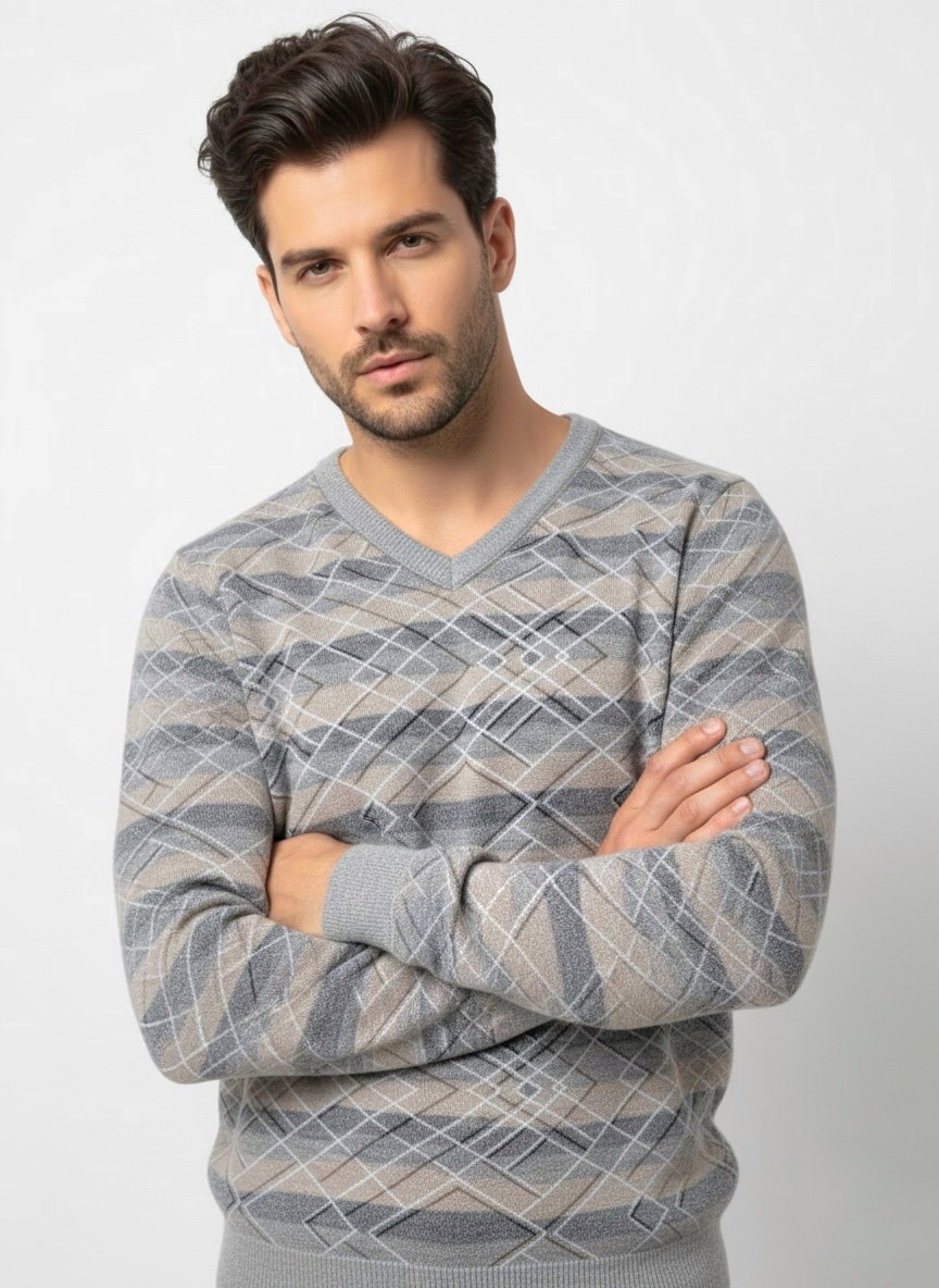 Earth Tone V-Neck Sweater with Checkered Pattern Copy Copy