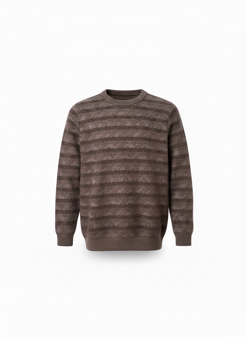 This inviting brown knit jumper boasts a unique take on classic stripes. The horizontal bands reveal a delicate textured pattern, adding depth and interest to its earthy tone. Designed for ultimate comfort, it’s an ideal choice for relaxed gatherings or stylish everyday wear.